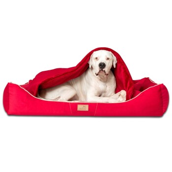 Orthopädisches Hundebett RUDOLPH | >>> inkl. Matratzenschoner mit integrierter Hundedecke GESCHENKT! Kostenloser Matratzenschoner mit integrierter Hundedecke WINTERZEIT | exklusive Kombination aus wärmenden Stoffen und integrierter Winterdecke ORTHOPÄDISCH | mobile 3-Schicht-Matratze – schweben auf Visco DIRT-LIQUID-PROTECT | schmutz- und wasserabweisendes „intelligentes“ Velours HYGIENISCH | abnehmbare und waschbare Decke dank umlaufenden Gummiband wie beim Spannbettlaken ULTRAWEICH | Hochwertiger, geschmeidiger Plüsch (Fadenlänge 10 mm) Achtung! Das Bett fällt groß aus! Bitte beachten Sie die Innenmaße! Unser RUDOLPH 4-Jahreszeiten ist ausgestattet mit einer Visco Matratze und Winterdecke kuschelig weichem Plüsch und wasserabweisendem High-Tech-Velours (selbst Kaffee oder Wein können schnell und rückstandslos entfernt werden) in bester Qualität und Exklusivität. Das orthopädische Hundebett im edlen Sofa-Design mit aufwendigen Verzierungen beschert Ihrem Vierbeiner gesunden Luxusschlaf, während das anschmiegsame und flauschige Plüsch ein kuscheliges Nest bildet. Die integrierte kuschelig warme Decke lässt sich abhnehmen und waschen. Seinen Kopf kann Ihr Liebling auf dem samtweich gepolsterten Rand ablegen. Absolute Premium-Klasse! Diese humanmedizinisch bewährte Materialwahl eignet sich für Hunde, die von Risiken oder Schäden an Knochen, Gelenken oder Wirbelsäule betroffen sind. Die Serie besteht aus 4 Größen (M+ 90 cm, L+ 110 cm, XL+ 130 cm und Übergroße XXL+ 160 cm) und 5 klassichen Farben. Pflegehinweis Bitte den Bezug nur mit geschlossenen Reißverschlüssen waschen! Waschen mit Feinwaschmittel ohne Weichspüler per Handwäsche oder im Schonwaschgang bei max. 30°C. Bei Maschinenwäsche ein Wäschenetz verwenden. Kunstleder zur Reinigung nass abwischen, waschen ist nicht nötig. Nach dem Waschen sanft in Form ziehen und die Reißverschlüsse immer vorsichtig öffnen und schließen! Nicht trocknergeeignet, nicht bügeln, nicht chloren, nicht bleichen. Versandhinweis Das Produkt wird für den Transport platzsparend zusammengerollt und sehr eng in einem Karton verpackt. Bitte legen Sie die das Hundebett nach dem Auspacken mindestens 12 – 24 Stunden bei Raumtemperatur aus. So gewährleisten Sie, dass sich die Schaum-Silikonflocken und die anderen Materialien aklimatisieren und danach auch wie gewünscht liegen.