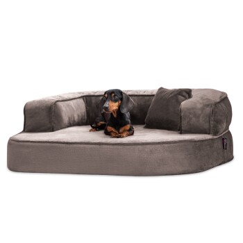 Orthopädisches Hundesofa SHARLEEN Aus hochwertigem und kuschelweichem Teddystoff mit orthopädischer Visco-Plus-Matratze Wir haben uns die Frage gestellt: Wie kann man unser hochwertigstes Hundebett LOTTE noch luxuriöser machen? Herausgekommen ist das Hundebett SHARLEEN, das mit demselben kuscheligen Teddystoff bezogen wurde wie unser beliebter FRANKLIN. Die Kombination aus unserer besten orthopädischen VISCO-PLUS-Matratze, dem festen Rand und dem besonders flauschigem Möbelstoff – bietet vor allem alten und kranken Hunden einen gesunden Schlaf. Erhältlich ist es zudem in vier Größen und neun modernen Farben. So lässt sich dieses Hundebett, das wie ein Sofa designed wurde, hervorragend mit fast jeder Wohnungseinrichtung in Einklang bringen. Eigenschaften Liegefläche: Orthopädisch Ortho Plus: Ja Visco Plus: Ja Premium: Ja Matratze: Integriert Reißverschluss: Ja Waschbar: Ja Maschinenwäsche: Ja Kuschelig: Ja Atmungsaktiv: Ja Anti-Rutsch: Ja Form: Oval Pflegehinweis – Bitte den Bezug nur mit geschlossenen Reißverschlüssen waschen! – Waschen mit Feinwaschmittel ohne Weichspüler per Handwäsche oder im Schonwaschgang bei max. 30°C. – Bei Maschinenwäsche ein Wäschenetz verwenden Kunstleder zur Reinigung nass abwischen, waschen ist nicht nötig Nach dem Waschen sanft in Form ziehen und die Reißverschlüsse immer vorsichtig öffnen und schließen! Nicht trocknergeeignet, nicht bügeln, nicht chloren, nicht bleichen Versandhinweis Das Produkt wird für den Transport möglichst platzsparend in einem Karton verpackt. Bitte legen Sie die das Hundebett nach dem Auspacken mindestens 12-24 Stunden bei Raumtemperatur aus. So gewährleisten Sie, dass sich die Schaum-Silikonflocken und die anderen Materialien akklimatisieren und danach auch wie gewünscht liegen.