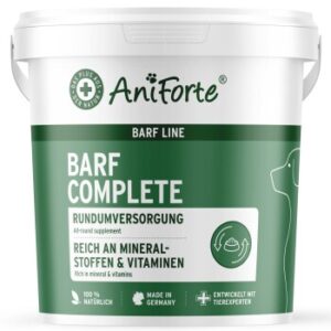 AniForte BARF Complete ist die natürliche, ausgewogene und artgerechte Rundumversorgung für Deinen Hund. Die Spezial-Zusatz-Mischung mit Kräutern bietet Deinem Hund die notwendigen Nährstoffe, die er täglich für ein vitales und fröhliches Hundeleben benötigt. Natürliche und artgerechte Rundumversorgung Hochwertiges BARF Zusatz Pulver Reich an Mineralstoffen und Vitaminen Wir bieten Dir eine optimale Nährstoffzusammensetzung an Das Produkt besteht zu 100 % aus natürlichen Rohstoffen wie Meeresalgenkalk, Malzkeimen, Bierhefe, Seealgenmehl, Leinsamenmehl, Eierschalen Pulver, Moringa sowie einer Kräutermischung mit Mariendistelfrüchten, Brennnesselblättern, Brombeerblättern, Kamille und Löwenzahnwurzel und eignet sich ideal als BARF Zusatz. Für eine Rundumversorgung Deines Lieblings empfehlen wir zudem die Fütterung von Knochen. Ideales BARF Zusatz Pulver – natürlich, ausgewogen und artgerecht Insbesondere bei der Rohfütterung wird viel Wissen von den Haltern vorausgesetzt. Diese Art der Fütterung beschränkt sich vor allem auf rohes Fleisch, Innereien, Knochen und Fisch, welche mit frischem Obst und Gemüse ergänzt werden. Wenn kein ausreichendes Wissen über die Anforderungen des Hundes vorhanden ist, besteht die Gefahr einer Mangelernährung. AniForte BARF Complete ist ein ausgewogenes BARF Zusatz Pulver aus wertvollen Naturstoffen, die den Vitamin- und Mineralstoffhaushalt Deines Lieblings auf natürliche Weise unterstützt. Aufgrund der ausgewählten Zusammenstellung des Ergänzungsfutters, ist das BARF Zusatz Pulver sowohl für ältere als auch Welpen ab dem 16. Lebenswoche geeignet. Das leichtdosierbare Feingranulat kann einfach unter das tägliche Futter gemischt werden. Durch den unvergleichlichen Geschmack nach frischen Kräutern erfreut sich unser Produkt an einer hohen Akzeptanz.