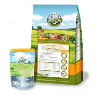 Futterset zur Unterstützung des Magen-Darm-Bereichs für große Hunderassen Ein empfindlicher Magen-Darm-Trakt kann für Hunde sehr belastend sein. Besonders bei großen Hunderassen ist eine gezielte Ernährung entscheidend, um das Wohlbefinden und die Verdauung optimal zu unterstützen. Deshalb haben wir ein hochwertiges Futterset für große Hunde zusammengestellt, das Sie hier zum Sparpreis erhalten. Gut bekömmliches Trockenfutter für große Hunde Eine ausgewogene Ernährung ist essenziell, um die Verdauung Ihres Hundes zu unterstützen und seine natürlichen Abwehrkräfte zu stärken. Unser Bellfor Wiesen-Schmaus ist ein getreidefreies, kaltgepresstes Trockenfutter , das speziell auf die Bedürfnisse großer Hunderassen abgestimmt ist. Es enthält sorgfältig ausgewählte Zutaten und einen hohen Fleischanteil, um eine optimale Nährstoffversorgung zu gewährleisten. Zudem sorgt das Kaltpressverfahren dafür, dass die Kroketten im Magen weniger aufquellen, was das Wohlbefinden großer Hunde zusätzlich unterstützt. Natürliche Unterstützung für die Darmgesundheit Unser Set enthält zusätzlich Bellfor Vermal Pulver, eine natürliche Ergänzung zur Förderung einer ausgeglichenen Darmflora. Dank der speziell abgestimmten Rezeptur ist es gut verträglich und kann problemlos über einen längeren Zeitraum gefüttert werden. Warum dieses Futterset? Dieses Set kombiniert hochwertige Zutaten mit einer speziell entwickelten Rezeptur, um die Verdauung Ihres Hundes bestmöglich zu unterstützen. Dank des Verzichts auf künstliche Zusatzstoffe und die Verwendung natürlicher Inhaltsstoffe trägt es zu einer ausgewogenen Ernährung bei. Das Futterset für große Hunde im Überblick: 4 kg Bellfor Wiesen-Schmaus (kaltgepresstes, getreidefreies Trockenfutter) 80 g Bellfor Vermal Pulver (natürliche Unterstützung für die Darmgesundheit) Bestellen Sie dieses hochwertige Futterset zum Sparpreis und fördern Sie die Verdauung Ihres Hundes mit bewährter Bellfor-Qualität!