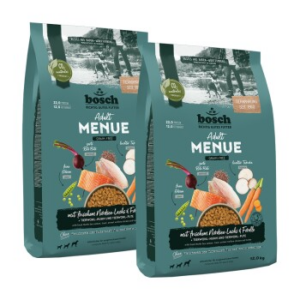 Das HPC MENUE Adult mit frischem Nordsee-Lachs & Forelle getreidefrei aus dem Hause bosch Tiernahrung ist ein vielfältiges Knuspermenü für die ausgewogene und vollwertige Ernährung Deines ausgewachsenen Hundes ab dem 12. Lebensmonat – hergestellt nach bewährten Rezepturen aus unserem traditionsreichen Familienunternehmen.Unser reichhaltiges Qualitätsfutter für adulte Hunde steht für eine bedarfsgerechte Ernährung mit 53 % Frischfleisch und frischem Fisch und einem Anteil von 67 % tierischem Protein am Gesamtprotein. Eine echte Delikatesse für Deinen anspruchsvollen Gourmethund im erwachsenen Alter.Fisch ist eine leicht verdauliche Proteinquelle und enthält einen hohen Anteil an mehrfach ungesättigten Omega-3-Fettsäuren, die den Stoffwechsel unterstützen und entscheidend zu schöner Haut und einem glänzenden Fell Deiner Fellnase beitragen. Durch den bewussten Verzicht auf Getreide in dieser erlesenen Rezeptur ernährst Du Deinen erwachsenen Hund besonders schonend und getreidefrei. Milde Kartoffeln und leichte Tapioka aus unserem Vertragsanbau in Togo runden dieses Erwachsenenmenü ab und liefern Energie für ausgiebige Spaziergänge in der Natur.In Kombination mit dem bunten Mix an Obst und Gemüse, wie zarte Rote Bete, leichte Tapioka und sanfte Erbsen sowie dem feinen Lachsöl aus eigener Herstellung liefert dieses hochwertige Alleinfutter Deinem treuen Herzensbrecher auf vier Pfoten alles, was er für ein langes und vitales Hundeleben braucht.