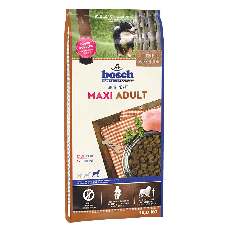 Das Trockenfutter von Bosch enthält einen Immun-Komplex aus Mannanen und Glucanen. Dieser wurde von Tierärzten entwickelt und dient zur Stabilisierung der Darmflora und des Immunsystems. Beigefügte Muschelextrakte sorgen für die optimale Versorgung von Knorpel und Gelenken. Bosch Maxi Adult 15kg hat einen angepassten Energie – und Proteingehalt (21,5% Eiweiß, 12,0% Fett). So wird das Risiko von Übergewicht minimiert. Krokettenform und – größe sind speziell auf das Gebiss großer Hunde abgestimmt.