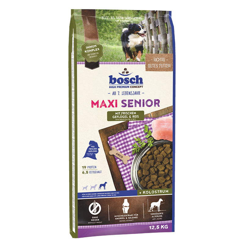 Der reduzierte Energiegehalt (nur 6,5 % Fett) bei gleichzeitig erhöhtem Gehalt an Ballaststoffen (6,5 % Rohfaser) verringert die Gefahr, dass ältere Hunde mit naturgemäß geringerer Aktivität an Körpergewicht zunehmen. MAXI SENIOR GEFLÜGEL wird mit einem hohen Anteil an frischem Geflügel (min. 25 %) und Reis (min 18%) und ohne Weizen hergestellt. Durch den Einsatz von Kolostrum wird das Immunsystem ebenso gestärkt wie durch den spezifischen Immun-Komplex aus Mannanen und Glucanen (von Tierärzten entwickelt). Die Vorteile im Überblick: verzögerte Zell-Alterung durch hohe Gehalte an Vitaminen und Spurenelementen Muschelextrakte für Knorpel und Gelenke mit Mannanen und Glucanen zur Stabilisierung der Darmflora und Immunabwehr mit Kolostrum, das die Abwehrkräfte des Hundes stärkt