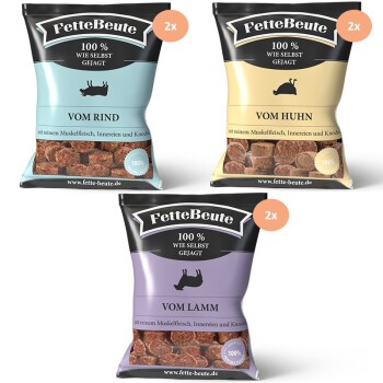 Mit FetteBeute bieten wir deinem Hund ein Hundefutter, das auf natürliche Weise alle Bedürfnisse abdeckt. Unsere Rezepturen bestehen ausschließlich aus hochwertigem Fleisch, Innereien und Knochen, ganz ohne Getreide oder zuckerhaltige Zusätze wie Obst und Gemüse . Jedes Menü ist ein echtes Alleinfuttermittel, das deinen Vierbeiner rundum versorgt. Wir verwenden nur die besten Zutaten: Frisches Premium-Muskelfleisch, Innereien wie Leber, Herz und Magen sowie fein gemahlene Weichknochen für eine optimale Kalziumversorgung. Durch die Zugabe von frisch verarbeiteten Mägen, in denen vorverdaute Nahrung in präbiotischer Form vorliegt, können wir auf weiteres Gemüse verzichten. Paket besteht aus: 2x FetteBeute Rind 800g 2x FetteBeute Huhn 800g 2x FetteBeute Lamm 800g Rind : Herzhaftes Rinderherz, calciumreiche Hühnerkarkassen und nährstoffreicher Rinderpansen – ideal für eine ausgewogene Ernährung. Huhn : Mageres Hühnerfleisch, Hühnerherzen und Pansen vom Rind, ergänzt durch Hühnerhälse und -leber sowie wertvolle Öle und Kräuter. Lamm : Zartes Lammhalsfleisch, vitaminreicher Lammpansen und Lammherzen, perfekt für empfindliche Hunde oder solche mit speziellen Ernährungsbedürfnissen. Vorteile im Überblick: Komplettmenü, keine weiteren Zusätze mehr notwendig Gesunde Frischfütterung leicht gemacht ohne aufwändige Futterpläne Frostfutter napffertig – Menü kann nach dem Auftauen direkt gefüttert werden Für Hunde aller Altersklassen geeignet Ideal portionierbare Nuggets (25 Gramm) BARF Rohfutter wie selbst gejagt 100% rein tierische Rezeptur Ohne Zusatz von Gluten und Zucker Verwöhne deinen Hund mit dem FetteBeute Komplettmenü und entdecke unser Probierpaket , um v erschiedene Geschmacksrichtungen auszuprobieren. FetteBeute – das Beste für deinen treuen Begleiter! Unsere BARF-Artikel der Marken proCani, Simple Barf und Fette Beute sind auch in vielen unserer Märkte erhältlich. Eine genaue Filialverfügbarkeit einzelner Artikel je nach Markt ist systembedingt leider nicht möglich. Weitere Informationen zum Markt in deiner Nähe findest du unter https://www.fressnapf.de/storefinder/