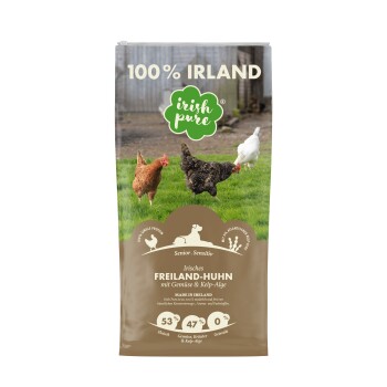 Spezielle Zuwendung für ältere Hunde – Unser neues Senior-TrockenfutterÄltere Hunde benötigen besondere Fürsorge, insbesondere wenn es um ihre Ernährung geht. Aus diesem Grund haben wir eine spezielle Trockenfuttersorte für Senioren entwickelt! Mit unserem Produkt „Irisches Freiland-Huhn mit Gemüse & Kelp-Alge, Senior“ versorgen Sie Ihren treuen Begleiter mit allem, was er oder sie braucht, und vermeiden Inhaltsstoffe, die Ihr Hund nicht mehr gut verarbeiten kann.Hoher Fleischanteil aus Freilandhaltung – 53 %Im Gegensatz zu unseren anderen Trockenfuttersorten enthält unser spezielles Senior-Hundefutter nur 53 % feinstes irisches Hühnerfleisch. Ältere Hunde benötigen nicht mehr so viele Rohproteine, daher garantieren wir einen optimalen Rohprotein-Gehalt, der das Verdauungssystem Ihres Seniors schont.Reich an frischem Gemüse und Kräutern – 44 %Satte 44 % unseres Futters bestehen aus Kartoffeln als Kohlenhydratquelle sowie anderen nach traditioneller irischer Art angebauten Gemüsesorten. Die perfekte Balance zwischen Fleischanteil und Gemüse & Kräutern versorgt Ihren Hund nicht nur mit den notwendigen Ballaststoffen, sondern auch mit wertvollen Vitaminen und Mineralien. Süßkartoffeln sind beispielsweise eine hochwertige Kohlenhydratquelle, die wichtige Ballaststoffe ohne jegliches Fett liefert.Bereichert mit Kelp-Algen – 3 %Die verbleibenden 3 % bestehen aus der Superfood-Zutat „Kelp-Alge“. Diese Braunalge ist reich an Vitaminen und Spurenelementen, die sich positiv auf die Gelenke, das Herz-Kreislauf-System und das Fell Ihres Hundes auswirken.100 % getreidefrei für ältere HundeWir haben uns bewusst dafür entschieden, Getreide in unseren Produkten wegzulassen. Insbesondere Hunde mit empfindlichem Verdauungstrakt neigen zu Unverträglichkeiten. Gluten, das in den meisten Getreidesorten enthalten ist, kann bei Glutenunverträglichkeit nicht gut verarbeitet werden. Der Darm reagiert mit einer Entzündungsreaktion auf Getreide im Hundefutter.Geben Sie Ihrem älteren Hund die spezielle Aufmerksamkeit, die er verdient, mit unserem hochwertigen Senior-Trockenfutter. Sorgen Sie für ein gesundes und glückliches Hundeleben, das auch im Alter voller Vitalität ist.