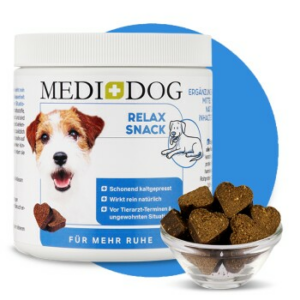 Für Ruhe und GelassenheitDer Medidog Relax Snack schmeckt lecker und versorgt deinen Hund mit wertvollen Zutaten, die ihn auch in ungewohnten Alltagssituationen unterstützen.Ungewohnte Alltagssituationen gelassen meisternDie sorgsam ausgesuchten Inhaltsstoffe wurden extra schonend kaltgepresst und sind natürlich getreidefrei. Der schmackhafte Snack versorgt deinen Liebling zusätzlich mit der Aminosäure L-Tryptophan, die sich positiv in ungewohnten Alltagssituationen, wie Tierarzt-Termine, Silvester oder langen Autofahrten, auswirken kann. Mit Liebe hergestelltFür deinen vierbeinigen Liebling ist nur das Beste gut genug. Wir haben uns als Premium-Hersteller auf hochwertige, sinnvolle und durchdachte Pflegeprodukte und Hundeernährung spezialisiert. Nur die höchste Qualität ist für uns gut genug. Unsere Rezepte werden nach neuesten wissenschaftlichen Erkenntnissen entwickelt um so das beste Produkt für deinen Liebling herstellen zu können.