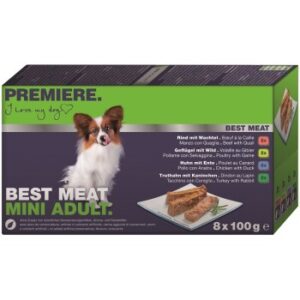 Mit feinsten Stückchen in leckerer Pastete werden auch die anspruchsvollen Feinschmecker verwöhnt. PREMIERE Best Meat Mini Adult ist speziell auf die Bedürfnisse der kleinen Hunde angepasst. Unser Multipack besteht aus: 2x Rind mit Wachtel 2x Geflügel mit Wild 2x Huhn mit Ente 2x Truthahn mit Kaninchen Mit insgesamt 65% tierischen Bestandteilen in PREMIERE Best Meat Mini Adult bekommt Ihr Hund wichtige Proteine und gut verwertbare Aminosäuren, damit die natürliche Vitalität und Fitness unserer quirligen kleinen Lieblinge erhalten bleibt. Inulin unterstützt zusätzlich eine optimale Verdauung. Die Vorteile im Überblick: 65% Fleisch und tierische Bestandteile Mit Inulin zur Unterstützung einer optimalen Verdauung Feinste Stückchen in Pastete für die kleinen Feinschmecker Mit Vitaminen, Spurenelementen und Mineralstoffen Ohne Zusatz von Aroma- und Farbstoffen Ohne Zusatz von Soja oder Zucker. *Schmeckt nicht? Mit unserer Akzeptanzgarantie bekommst du dein Geld zurück und suchst dir einfach ein anderes Futter aus.