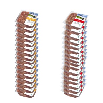 proCani BARF-Paket pur „Carnivor“ Paket gehaltvolles Hundefutter für alle Altersklassen.Die Mischung aus Rind Carnivor und Huhn Carnivor bildet eine ausgewogene Grundlage für eine optimale Nährstoffversorgung. Das enthaltene Set, bestehend aus Muskelfleisch, Organen, Knochen sowie Pansen, liefert derweil ein anregendes Geschmacksspektrum. Das “Carnivor“ Paket enthält zahlreiche Mineralstoffe, Vitamine und Spurenelemente. BARF verzichtet beim Tierfutter vollständig auf den Zusatz von Konservierungsstoffen und anderen Zusätzen wie Zucker. 16er Paket besteht aus: Rind Carnivor 8x500g Huhn Carnivor 8x500g 32er Paket besteht aus: Rind Carnivor 16x500g Huhn Carnivor 16x500g 48er Paket besteht aus: Rind Carnivor 16x500g Huhn Carnivor 16x500g Ente Carnivor 16x500g