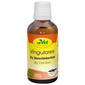 Singulares D3 Dorschlebertran ist ein hochwertiger Lieferant für Omega-3-Fettsäuren und Vitamin D. Omega-3-Fettsäuren (z.B. Linolensäure) sind mehrfach ungesättigte Fettsäuren, die vom Körper nicht selbst erzeugt werden können. Daher werden sie als essentiell bezeichnet und müssen dem Organismus über die Nahrung zugeführt werden. Vitamin D ist wichtig für den Knochenaufbau und die Regulierung des Calcium-Haushaltes. Einzelfuttermittel für Hunde und Katzen