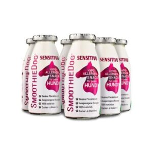 Der Hundesmoothie für Hunde mit Allergien & Unverträglichkeiten: SmoothieDog SENSITIVO ist der Hundesmoothie für Hunde mit Allergien und Futtermittelunverträglichkeiten. WENIGER ist bei dieser Sorte ganz bewusst MEHR! Aktuell stehen Hundeeltern immer häufiger Allergien gegenüber und nach einem Gang zum Tierarzt heißt es „Ausschlussdiät“. Unser SENSITIVO mit Pferdefleisch kann dabei wunderbar als Snack gefüttert werden und den Fütterungsplan attraktiv und lecker ergänzen. Wie alle unsere Sorten ist auch dieser Smoothie für Welpen und Senioren bestens geeignet. SENSITIVO aus Pferdefleisch, Zucchini, Pastinake und Trinkwasser: Vorbehalte gegenüber Pferdefleisch sind unbegründet. Wir beziehen das Fleisch von einem mehrfach ausgezeichneten Betrieb mit 20 Jahren Familientradition. Die Inhaberin erklärte uns sehr verständlich weshalb Pferdefleisch perfekt für den Verzehr ist: „Ein Pferd würde niemals aus einem schmutzigen Trog trinken und ein Pferd würde niemals in einer schlechten Umgebung wie beispielsweise in Massentierhaltung gesund bleiben. Wenn Fleisch – dann Pferdefleisch!“ Pferdefleisch überzeugt mit vielen Vorteilen: Es ist sehr mager und liegt nicht schwer im Hundemagen. Es ist ein sehr neutrales Fleisch mit hervorragenden Nährwerten, dabei aber sehr schmackhaft und hochwertige Proteinquelle mit wenig Cholesterin. Der Hund wird mit lebenswichtigen ungesättigten Fettsäuren versorgt. Der hohe Gehalt an Vitamin A und B unterstützt die Gesundheit von Haut, Fell und Zähnen und trägt zur gesunden Körperfunktion des Hundes bei.