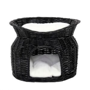 GEMÜTLICHER RUHEPLATZ. Dieser Weidenkorb für Katzen bietet mit dem Liegedach und der Höhle 2 Liegeflächen gleichzeitig, die perfekt zum Ausruhen und Beobachten geeignet sind. MIT WEICHEN LIEGEKISSEN. Die 2 flauschigen Liegekissen sorgen für gemütliche Momente, sind herausnehmbar und können per Handwäsche gereinigt werden. WEIDENHOLZ ALS HINGUCKER. Der natürliche Rohstoff Weidenholz garantiert eine umweltfreundliche Herstellung und dient als moderner Blickfang in Ihrem Zuhause. VERSCHIEDENE FARBEN. Diese Katzenhöhle ist in den Farben Grau, Schwarz und Braun mit 2 weißen Liegekissen erhältlich. MAßE. Mit den Abmessungen 55 x 39 x 43 cm ist dieser Katzenkorb ideal auch für kleine Hunde und kleine Räume geeignet. Dieser Katzenkorb aus Weidenholz ist der ideale Ruheplatz für 2 Katzen gleichzeitig. Das Liegedach lädt zum Schlafen und Beobachten ein und die Höhle dient als Rückzugsort. Beide Liegeflächen des Katzennests sind mit einem weichen und gemütlichen Liegekissen ausgestattet, dass herausgenommen und dann per Handwäsche gereinigt werden kann. Der natürlich wachsende Rohstoff Weide sorgt für eine umweltschonende Herstellung dieser Kuschelhöhle. Dieses Weidenholzkörbchen für Katzen wird in Ihrem Zuhause für einen echten Blickfang sorgen und ist in mehreren Farben erhältlich. Sie können aus den Farben Grau, Schwarz und Braun wählen und mit den Abmessungen 55 x 39 x 43 cm passt der Katzenturm ideal auch in kleine Räume und Wohnungen. Ebenso können Sie die Liegehöhle für Welpen und kleine Hunde nutzen.