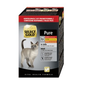 Die SELECT GOLD Pure Rezepturen enthält gut bekömmliche Zutaten und eignet sich daher besonders für ernährungssensible Katzen sowie bei Futtermittelunverträglichkeiten. SELECT GOLD Pure Adult in Soße ist eine speziell entwickelte, ausgewogene Premium-Nassnahrung – Alleinfuttermittel für ausgewachsene Katzen ≥ 1 Jahr. Die getreidefreie Rezepturen enthält gut bekömmliche Zutaten und eignen sich daher besonders für ernährungssensible Katzen sowie bei Futtermittelunverträglichkeiten. Die Vorteile im Überblick: 1 ausgewähltes Protein Ohne Getreide, Gemüse und Kartoffeln Besonders verträglich bei Empfindlichkeiten ADULT: Optimaler, auf das Bedürfnis angepasster Energiegehalt zur Unterstützung des Erhalts des Idealgewichts Prebiotisches Inulin kann den Aufbau und Erhalt einer stabilen Darmflora unterstützen Ohne Zusatz von Zucker, Soja, Konservierungsmitteln und Farbstoffen Entwickelt mit Unterstützung von Tierärzten Hergestellt in Deutschland *Schmeckt nicht? Mit unserer Akzeptanzgarantie bekommst du dein Geld zurück und suchst dir einfach ein anderes Futter aus.