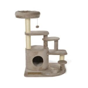 AniOne Seniorenkratzbaum Beatrix Stabiler Kratzbaum zum Kratzen, Spielen, Ausruhen und Schlafen Geeignet für ältere und körperlich beeinträchtigte Katzen dank Kletterhilfe Große und bequeme Liegefläche Geeignet für Katzen jeder Größe Inkl. Kratzgummi auf der Bodenplatte Inkl. Plüschball zur Befriedigung des Spieltriebs deiner Katze Inkl. Werkzeug und Aufbauanleitung für eine einfache und schnelle Montage Material: Sisal, Polyester, Spanplatte, Gummi Maße: ca. 88 x 60 x 101cm