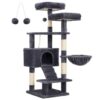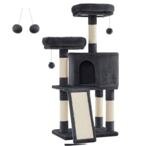 Ihre süße Katze darf die folgenden Besonderheiten genießen: – 2 Aussichtsplattformen oben zum Beobachten – 1 bequeme Kuschelhöhle zum Versteckspiel – Stämme mit Sisal auf jeder Ebene, zum Schärfen der Krallen – 1 großes Kratzbrett, das gleichzeitig als Treppe dient – Stufenweise angeordneter Aufbau für problemloses Auf- und Absteigen – 2 Fellbälle für extra Spaß Kleiner Raum, große Freude: Verwöhnen Sie Ihren Stubentiger auch in begrenzten Räumen! Dieser Kratzbaum (50 x 35 cm) nimmt nur wenig Bodenfläche ein, bietet Ihrer Katze aber endlose Freude, von Klettern über Kratzen bis hin zum Entspannen Wo ist der Lieblingsplatz Ihrer Katze? Gibt es etwas genüsslicheres für Ihre Katze, als auf der flauschigen Aussichtsplattform zu liegen und das Köpfchen auf dem erhöhten Rand zu betten? Ach ja, eine Katze müsste man sein… Stundenlanger Kratzspaß: Die 5 Stämme sind mit Sisal umwickelt. Hier und am großen Kratzbrett darf Ihre Katze ihre Krallen nach Herzenslust schärfen. Darüber hinaus bleiben Ihre Möbel vor den Krallen Ihres Lieblings verschont – Die Möbel sagen Danke! Für eine energiegeladene Katze? Kein Problem! Dieser Kratzbaum verfügt über ein verstärktes Fundament sowie einen Kippschutz, damit Ihr süßes Energiebündel darauf wild herumspringen kann Machen Sie Ihre Katzen glücklich: Verwöhnen Sie Ihre Katzen mit diesem Kratzbaum, damit sie sich nicht einsam fühlen, wenn Sie außer Haus sind, sondern vergnügt spielen sowie sich komfortabel entspannen können Feandrea Hinweise: – Zur Sicherheit befestigen Sie das Produkt bitte unbedingt mit dem mitgelieferten Kippschutz an der Wand – Falls die Katzenhöhle beschädigt wird, reparieren oder ersetzen Sie sie bitte rechtzeitig, um Verletzungen durch beschädigte Teile zu vermeiden. – Falls Ihre Katzen auf dem Fellbällchen oder Gummiband herumkauen sollten, so entfernen Sie das Spielzeug bitte umgehend und bewahren Sie es an einem für Ihre Katze unzugänglichen Ort auf.