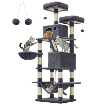 Warum sollten Sie sich für diesen mehrstöckigen Katzenkratzbaum entscheiden? – Sicherheit geht vor: Hochwertige Materialien, ein verstärkter Sockel und ein Kippschutz sorgen für einen stabilen und sicheren Halt, damit Ihre Katzen sicher spielen können. – Rundum-Komfort: Der gesamte Katzenbaum ist mit weichem Plüsch überzogen, der für wohlige Gemütlichkeit sorgt. – Rundum-Spaß: Mit 2 Pompons, einem Spielseil, 2 Höhlen, einem Korb und einer Hängematte wird es Ihren Katzen auf diesem Kratzbaum nie langweilig. – Schützt Ihr Sofa: 13 Kratzsäulen und 1 Kratzrampe unterhalten die unruhigen Krallen und verhindern, dass sie Ihre Möbel ruinieren. – Auch für Kätzchen und ältere Katzen geeignet: Sowohl das mehrstufige Design als auch die Rampe erleichtern das Hoch- und Herunterklettern. [168 cm hoch, endloser Kletterspaß] 168 cm hoch. 5 Stufen. Kurze Abstände von 25-30 cm zwischen den Stufen. Dieser Kratzbaum erleichtert das Auf- und Absteigen und ist perfekt für Katzen, die gerne klettern und hoch hinaus wollen [All-in-One Spielplatz] 2 gut gepolsterte Plattformen, 2 kuschelige Höhlen, 1 flauschiger Korb, 2 Plüschbälle und 1 Hängematte – Jede Katze findet einen Lieblingsplatz auf diesem mehrstöckigen und bequemen Katzenbaum – perfekt für Haushalte mit mehreren Katzen [Stabil, sicher und geschützt] Dank Qualitätsspanplatten, einer großen Basis mit verstärkten Bodenleisten sowie einer Kippschutz-Vorrichtung ist dieser stabile Kratzbaum für bis zu 6 große Katzen (jeweils 5 kg) geeignet [13 Kratzsäulen und 1 Kratzrampe aus Sisalseil] Mit Kratzflächen auf jeder Ebene können Ihre Katzen nach Herzenslust kratzen, damit sie endlich von Ihrem Sofa ablassen! Außerdem hilft die Kratzrampe Kätzchen und ältere Katzen beim Hinaufklettern [Einfache Montage] Dank der simplen Struktur, einer klaren Anleitung und der gekennzeichneten Teile wird der Aufbau dieses Kratzbaums zum Kinderspiel [Leicht zu reinigen] Haare, Schmutz und Krümel … keine Sorge. Mit einer Fusselrolle oder einem Staubsauger lassen sie sich leicht reinigen [Ersatz-Plüschbälle] Wenn Ihre Katzen es mit einem Plüschball ein wenig zu wild treiben oder wenn Sie keinen Plüschball mit Glöckchen mögen, kommen Ihnen diese 2 Ersatz-Plüschbälle zu Hilfe. Sie können ihn nach Bedarf ersetzen Feandrea Hinweise: – Wenn Ihre Katze beginnt, den Pompon oder das Gummiband zu kauen oder zu fressen, entfernen Sie bitte das Spielzeug und bewahren Sie es für eine Weile außerhalb der Reichweite Ihrer Katze auf. – Wenn die Katzenhöhle zerkratzt und beschädigt wird, reparieren oder ersetzen Sie sie bitte vor dem weiteren Gebrauch, um das Verletzungsrisiko für Ihre Katze zu minimieren. – Da Katzen gerne springen und spielen, befestigen Sie das Produkt bitte mit dem mitgelieferten Kippschutz an der Wand, die notwendige Stabilität zu gewährleisten.