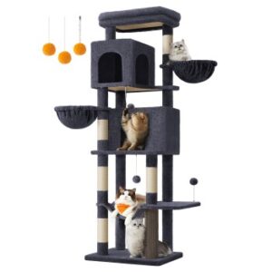 [175 CM HOCH, MEHRSTUFIGER SPASS] Ihre Lieblinge können auf diesem Kratzbaum ausgiebig spielen und entspannen. Mit 2 Höhlen, 2 Liegemulden, einer gemütlichen Hängematte, einer großen Plattform und attraktiven Spielzeugen ist er ideal für Mehrkatzenhaushalte [FREIHEIT FÜR PFOTEN] Lassen Sie Katzenpfoten mit den Sisalstämmen auf jeder Ebene kratzen. Ihre Stubentiger können sich strecken, kratzen und sich wie der König des Dschungels fühlen. Die untere Bürste ermöglicht angenehme Selbstpflege [WEICHHEIT NEU DEFINIERT] Das mit Plüsch bezogene Katzenhaus verspricht einen komfortablen und warmen Rückzugsort für die Fellknäuel. Es ist das perfekte Heiligtum für sie, um sich auszuruhen, zu entspannen und die schönen Dinge des Lebens zu genießen [SICHER BEI JEDEM SCHRITT] Der Katzenkratzbaum ist aus robusten Spanplatten gefertigt und sorgt für sicheres Klettern, während der mitgelieferte Kippschutz hohe Sicherheit beim Spielen bietet und jeden Sprung und jedes Klettern zum sicheren Abenteuer macht [MÜHELOSE MONTAGE] Mit mitgelieferten Montagewerkzeugen, wenigen Teilen und klarer Anleitung ist der Aufbau dieses großen Kratzbaums ganz leicht. Ihre Katzen werden im Handumdrehen ihren neuen Spielplatz genießen Produktdetails: Farbe: Sandbeige/Dunkelgrau/Taubengrau Material: Holzspanplatte, 500 g/m² Plüsch, Sisal Größe: 57 x 45 x 175 cm (L x B x H) Durchmesser der Sisal-Kratzsäulen: 71mm Gewicht: 17 kg Feandrea Hinweise: – Wenn Ihre Katze beginnt, den Plüschball oder das Gummiband zu kauen oder zu fressen, entfernen Sie bitte den Plüschball und bewahren Sie ihn außerhalb der Reichweite Ihrer Katze auf. – Da Katzen gerne springen und spielen, befestigen Sie den Kratzbaum bitte mit dem mitgelieferten Kippschutz an der Wand, um eine sichere Nutzungsumgebung zu schaffen.