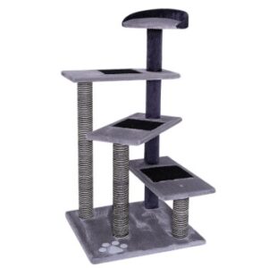 KOMFORTZONE. Dieser Katzenkratzbaum mit weichem Plüsch und viel Sisal ermöglicht artgerechte Krallenpflege und bietet genügend Ruhemöglichkeiten RUHEPARADIES. Dieser Katzenbaum mit 3 Plateaus und gemütlicher Liegefläche oben lädt zum Entspannen ein und auch das beliebte Beobachten kommt nicht zu kurz OPTIMALE KRALLENPFLEGE MIT SISAL. Die widerstandsfähigen Stämme des Katzenspielturms sind vollständig mit zweifarbigem Sisal umwickelt und ermöglichen zusammen mit 3 Plateaus mit integrierten Sisalkratzflächen die nötige Krallenpflege PLATZSPARENDER EYECATCHER. Mit einer Höhe von 100 cm passt dieser Kratzbaum optimal in jeden Raum und sorgt für einen angenehmen Anblick mit Wohlfühlgarantie für Tier und Mensch MAßE UND FARBEN. Der langlebige Kletterbaum misst 50x50x100 cm und ist in den Farben braun/beige, Grau und beige/braun erhältlich Mit diesem Katzenspielbaum bieten Sie Ihrer Samtpfote einen echten Sisal-Allrounder. Gleich drei Aussichtsplateaus des Kratzturms mit integrierten Sisal-Kratzflächen und die Stämme mit robustem, zweifarbigem Sisal unterstützen die Krallenpflege und halten Ihre Katze somit von den Möbeln fern. Zusätzlich sind die Plateaus ideal für die Ruhezeiten und das Beobachten der Umgebung geeignet. Eine Liegefläche mit weichem Plüsch rundet die Entspannungs- und Beobachtungsmöglichkeiten ab. Durch die geringe Höhe von 100 cm können Sie die Kratzsäule überall aufstellen und für einen echten Blickfang mit den ansprechenden Farben sorgen. Die Aufbauanleitung ist leicht verständlich und wird zusammen mit dem dementsprechenden Montageset mitgeliefert. Im Lieferumfang sind enthalten: 1 x Kratzbaum, 1 x Aufbauanleitung, Montageset