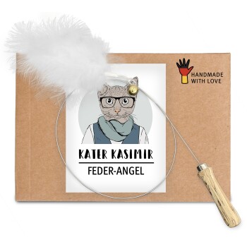 Premium Katzenangel mit einem Anhänger aus Naturfedern.Die hochwertigen Naturmaterialen der Katzenspielzeuge von KATER KASIMIR wecken in Deiner Katze sofort den Jagdtrieb. Die nachhaltigen Produkte sind kleinen Beutetieren wie Vögeln oder Mäusen nachempfunden. Sie bestehen aus tierischen Produkten wie Federn oder Fellen. Alle Artikel werden in Deutschland liebevoll von Hand hergestellt und bieten jungen Müttern bei einer fairen Bezahlung die Möglichkeit, in Heimarbeit Beruf und Familienleben mit einander zu vereinbaren. Kurze Transportwege sparen Treibstoff und schonen die Umwelt.Diese Spielangel besteht aus einem Griffstück aus massiver Buche und einem langen und stabilen Stahldraht. Am dessen Ende befindet sich ein Anhänger aus Naturfedern sowie ein Glöckchen aus Deutschlands letzter Glöckchenmanufaktur in fünfter Generation in Nürnberg.
