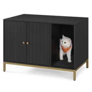 [Stilvoller Katzenklo-Schrank] Mit der weißen Oberfläche und dem goldfarbenen Metallrahmen lässt sich dieser moderne Katzenklo-Schrank leicht in Ihr Zimmer integrieren und verleiht dem unordentlichen Katzenklo-Bereich ein neues Gesicht [Weckt natürlichen Instinkt Ihrer Katzen] Die versteckte Katzentoilette bietet Ihre Vierbeiner mehr Privatsphäre; der gewundene Eingang befriedigt ihren natürlichen Erkundungsdrang; die Kratzmatte im Eingang lässt Ihre Katze kratzen und Streu auffangen [Passt für die meisten Katzenklos & Räume] Mit einer Größe von 52 x 50 x 41,9 cm passt das Innenfach in die meisten Katzenklos. Der Fronteingang ermöglicht es Ihnen, ihn an den meisten Orten aufzustellen, ohne sich Gedanken über die Richtung zu machen [Für Sie & Ihre Katzen] Verwenden Sie es zum Verstecken der Katzentoilette oder als gemütliches Katzenhaus; Sie können es auch als Couchtisch oder TV-Ständer verwenden, damit Sie und Ihre Katze dieses vielseitige Möbelstück gemeinsam nutzen können [Einfache Montage & Reinigung] mit einer klaren Anleitung und gekennzeichneten Teilen können Sie diese Katzenbox in 30 Minuten aufbauen. Die hohen Beine machen es Ihnen leichter, den Boden zu reinigen und durch die beiden Türen fällt kaum Streu heraus Produktdetails: Farbe: Weiß-Goldfarben/Schwarz-Goldfarben Material: Holzspanplatte, Stahl Größe: 80 x 50 x 55 cm (L x B x H) Gewicht: 16,3 kg Max. statische Belastbarkeit der Oberfläche: 60 kg Max. statische Belastbarkeit des Bodens: 30 kg Feandrea Hinweise: Treten oder setzen Sie sich nicht auf den Katzenklo-Schrank.