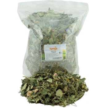 Entdecken Sie den Getzoo Kräutergarten – Eine natürliche Quelle der Gesundheit für Ihr Haustier Der Getzoo Kräutergarten ist eine sorgfältig zusammengestellte Mischung aus Kräutern und Blüten, die auf den natürlichen Ernährungsgewohnheiten von Herbivoren basiert und speziell dafür entwickelt wurde, die Gesundheit Ihrer Tiere zu unterstützen und zu fördern. Natürliche Inhaltsstoffe für das Wohlbefinden Ihres Tieres Mit einer reichen Auswahl an Kräutern wie Melisse, Pfefferminz, Lavendel und Brennnessel sowie heilfördernden Blüten wie Kornblumen und Ringelblume bietet der Kräutergarten eine umfassende Unterstützung für das Immunsystem Ihrer Haustiere und hilft bei der Vorbeugung und Behandlung von Gesundheitsproblemen. Optimal für eine gesunde Ernährung Dieser Kräutergarten ist ideal für alle Herbivore, einschließlich Degus, Chinchillas, Kaninchen und Meerschweinchen. Er ist besonders empfehlenswert für Tiere mit Magen-Darm-Problemen oder während der kälteren Monate, wenn Tiere in Außenhaltung zusätzliche Nährstoffe benötigen. Zusammensetzung: Enthält Kamille, Hibiskus, Rosenblüten, Kornblume, Lavendel, Melisse, Pfefferminz, Ringelblume, Brennnesselblätter, Birkenblätter, Dillstiele, Korianderstiele, Echinacea. Fütterungsempfehlung: Ca. 1-2 Hände pro Tier am Tag. Eine Überfütterung ist nicht möglich, ideal für die tägliche Zufütterung. Mit dem Getzoo Kräutergarten bieten Sie Ihren Tieren nicht nur eine leckere und abwechslungsreiche Ernährung, sondern tragen auch aktiv zu deren Gesundheit und Wohlbefinden bei.
