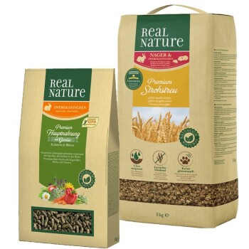 REAL NATURE Nagernahrung Zwergkaninchen mit Gemüse 1,5kg Naturnahes getreidefreies Alleinfuttermittel für Zwergkaninchen mit Gemüse Kräutern und Blüten. Unsere Real Nature Hauptnahrung für Zwergkaninchen wurde im Einklang mit der Natur entwickelt. Daher achten wir nicht nur auf die sorgfältige Auswahl der Zutaten, sondern auch auf die richtige Kombination und eine schonende Zubereitung. Natürliche Zutaten: Real Nature gibt das Beste aus der Natur weiter. Hochwertige Ingredienzien werden mit Nahrungsmittelexperten gewissenhaft ausgewählt und miteinander kombiniert. Schonendes Produktionsverfahren: Durch das Kaltpress-Verfahren werden die Zutaten nur bei sehr geringer Wärmezufuhr behandelt. Dadurch bleibt der hohe natürliche Nährwert aller Ingredienzien weitestgehend erhalten. Mono-Pellets: Die Mono-Pellets unterstützen den Zahnabrieb und verhindern selektives Fressen. Zutaten aus der Heimat der Zwergkaninchen: Erlesene Kräuter, Gemüse und Blüten sorgen für eine natürliche Ernährung. Nährwertkomplex: Ausgewählte Früchte enthalten natürliche Vitamine und wertvolle Antioxidantien. Das Rohfaser-Stärke-Verhältnis ist optimal an die Bedürfnisse von Zwergkaninchen angepasst und kann darm- und verdauungsregulierend wirken und für eine ausgewogene Ernährung sorgen. Wir garantieren: Dem Produkt wurde kein Zucker zugesetzt, es enthält keine künstlichen Konservierungsmittel, Farb- und Aromastoffe und ist daher besonders gut verträglich. Wir stellen höchste Qualitätsanforderungen an alle ausgesuchten Zutaten sowie den gesamten Produktionsprozess. Alleinfuttermittel für Zwergkaninchen, weitere Informationen erhalten Sie hier:  info@fressnapf.com Fütterungsempfehlung Futternapf auffüllen und leer fressen lassen. Orientierungswert: Ein erwachsenes Zwergkaninchen benötigt je nach Größe und Aktivität ca. 70 – 100 g REAL NATURE Premium-Nahrung für Zwergkaninchen pro Tag. Stets frisches Heu und zimmerwarmes Wasser anbieten. REAL NATURE Streustroh Supersoft 8 Kg Das REAL Nature Premium-Strohstreu ist eine hochwertige Unterstreu aus gepresstem Stroh für Zwergkaninchen und Nager.  Es ist zu 100% natürlich und garantiert höchste Streuqualität. Die Streu ist vollständig biologisch abbaubar, ideal für die Kleintierhygiene und für die Umwelt. Qualitätsversprechen: Ultra saugstark: Mit einer ultra starken Saugkraft von bis zu 500% ist die REAL NATURE Premium-Strohstreu extrem ergiebig und dadurch sparsam im Verbrauch. Geruchsbindend: Die Pellets nehmen Feuchtigkeit tief in ihrem Inneren auf und verhindern so unangenehme Geruchsbildung – gleichzeitig verströhmen sie einen angenehmen Duft von frischem Stroh. Extrem Pfotensanft: Durch die zerkleinerten Pellets ist die REAL NATURE Premium-Strohstreu besonders weich und angenehm für sensible Pfötchen. Extra entstaubt: Die Pellets aus höchster Strohqualität werden zweifach  entstaubt und sind somit selbst für Allergiker geeignet.  Gebrauchsanweisung: 1. Das Kleintierheim mit einer ca. 3-7cm hohen Schicht REAL NATURE Premium Strohstreu füllen. 2. Für optimale Hygiene das Kleintierheim regelmäßig mindestens jedoch 1 mal pro Woche – komplett reinigen. 3. Entsorgung über den Hausmüll oder die Biotonne (regionale Entsorgungsvorschriften beachten); kompostierbar.  Tipp: Für eine optimale Gestaltung Ihres Kleintierheims empfiehlt sich je nach Tierart eine Kombination aus verschiedenen Streu-Schichten.
