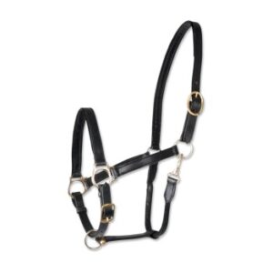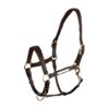 Robustes, filigranes Lederhalfter mit unterlegtem Nasenriemen und Genickstück. Vermessingte Beschläge und mehrfache Verstellbarkeit an Genickstück und Kinnriemen.