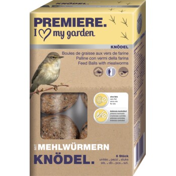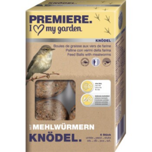 Unsere PREMIERE Knödel mit Mehlwürmern sind ein ideales Ganzjahresfutter für alle Wildvögel. Die Knödel mit Mehlwürmern sind besonders beliebt bei Insektenfressern, wie z.B. dem Fitis, und sorgt für ein geselliges Treiben rund um den Futterplatz. Unsere PREMIERE Knödel mit Mehlwürmern sind frei von Plastiknetzen, in denen sich Wildvögel verfangen könnten. Verwenden Sie stattdessen einfach einen passenden Knödelhalter. Er erleichtert die Handhabung und bietet den Vögeln besseren Halt und einen festen Futterplatz. Vorteile im Überblick: mit gehaltvollen Zutaten – ideal für die nahrhafte Zufütterung umweltfreundlich ohne Netz Ambrosia-kontrolliert Mit dem vielfältigen PREMIERE Sortiment für Wildvögel können Sie nicht nur Amseln, Meisen, Rotkehlchen und Co. in ihren Garten locken und aus der Nähe bestaunen, sondern gleichzeitig einen aktiven Beitrag zum Vogelschutz leisten.   Vor allem in der Zeit des Nestbaus sowie in der Brut- und Aufzuchtzeit, in der die Vögel viel Energie benötigen, ist die Wildvogelfütterung besonders wichtig.  Zur Unterstützung der Aufzucht von Jungvögeln und deren Eltern eignet sich insbesondere proteinreiches Futter mit Insekten, wie etwa die PREMIERE Knödel mit Mehlwürmern. Doch unsere heimischen Wildvögel benötigen das ganze Jahr über zusätzliche Nahrung, da sie in der freien Natur immer weniger Futter finden. PREMIERE bietet eine große Auswahl an erlesenem Wildvogelfutter für die ganzjährige Vogelfütterung. Mit einer ganzjährigen Fütterung helfen Sie dabei die Vogelpopulation zu erhalten.  Unterstützen Sie gemeinsam mit PREMIERE den Schutz unserer heimischen Wildvögel!